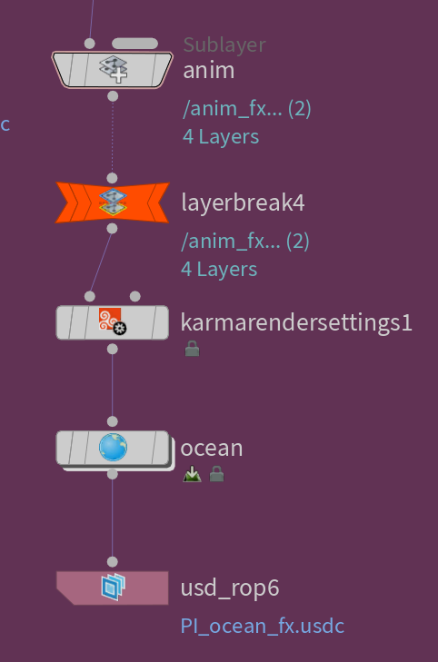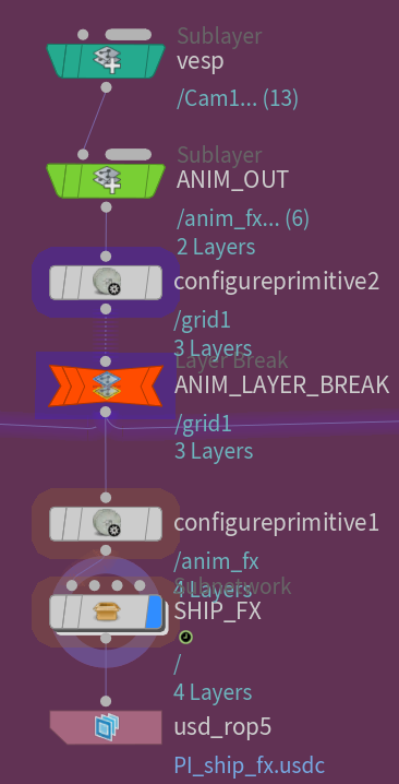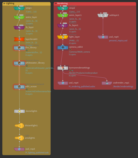 Similar to my FX layers, I created a lighting layer. The advantage to using a USD layer system was I could disable the FX layer to quickly preview my lighting and materials. I could then combine all the layers together and render them out. This could be done by creating a master file that references all the layers, or I could flatten the whole project into 1 USD file (and folder with external assets)